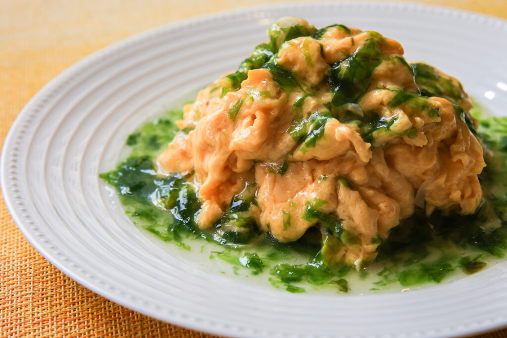 4.小柱とカニ肉入り卵炒め アサリ出汁の生のりあんかけ