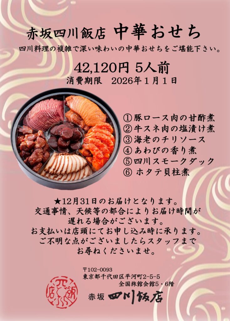 四川飯店おせちお取り扱いのお知らせ 2025/11/05四川飯店店舗からのお知らせ 日頃から赤坂四川飯店をご愛顧いただき誠にありがとうございます。 本年も「赤坂四川飯店中華おせち」受付、販売を開始いたします。 ご購入の方は画像下のリンクより申し込み用紙をダウンロードして頂き 必要事項をご記入後、FAX又は郵送にてご連絡下さい。 申し込み用紙は こちら よりご覧ください。 SHARE 日本橋 平日ランチ ¥1,500(税込み)伊豆食材フェアのお知らせ すべての記事一覧
